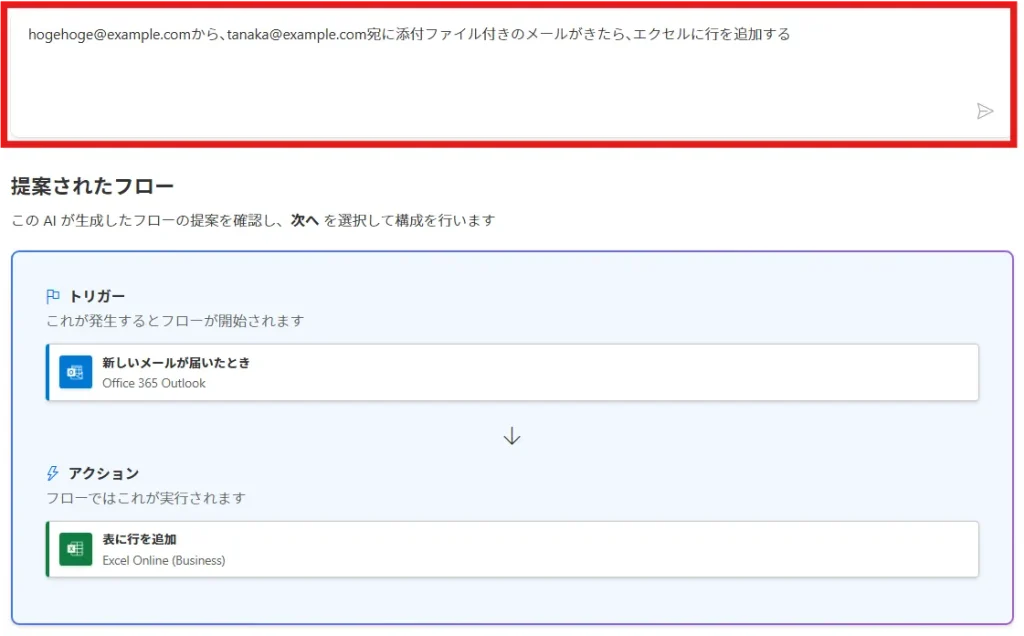 指示に従って、フロー(トリガー・アクション)の叩き台を作成してくれる機能です。