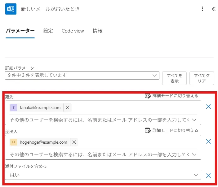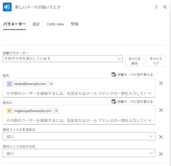 「hogehoge@example.comから、tanaka@example.com宛に添付ファイル付きのメールがきたら」に変更して