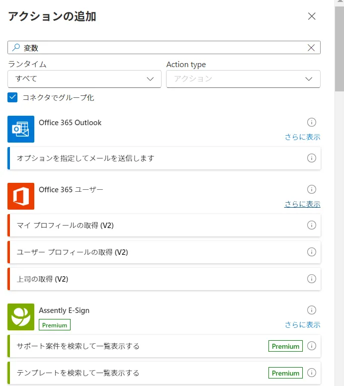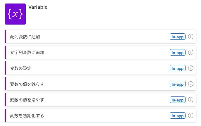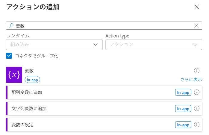 アクションの追加から検索ボックスに「変数」と入力しても、候補に出てきません。