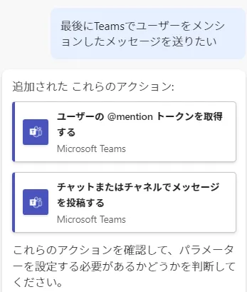 「Teamsでユーザーをメンションしてメッセージを送りたい」と指示すると「ユーザーの@Mentionトークンを取得する」だけが追加されることがほとんどでした。