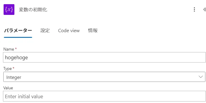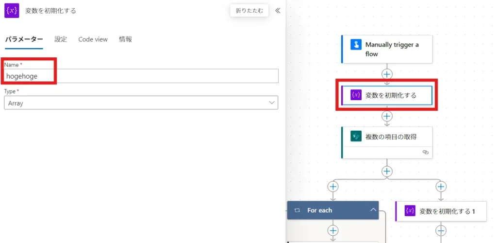 「変数を初期化する 1」の変数の名前を、「hogehoge」に変更して