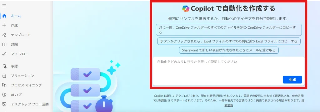 フローの新規作成はホーム画面から、アクションの追加・修正はチャット欄からCopilotを利用できます。