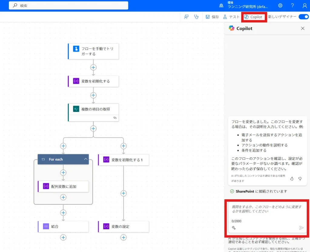 既存のフローに対してアクションの追加・修正を指示するには、フロー編集画面の「Copilot」ボタンをクリックしてチャットを展開します。