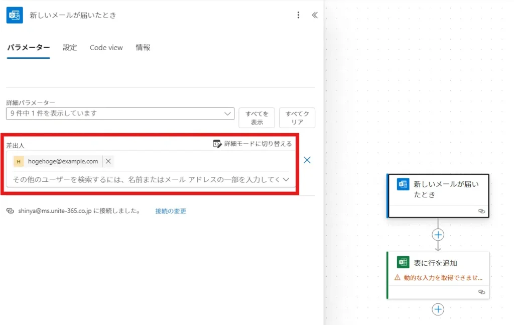 hogehoge@example.comから、tanaka@example.com宛に添付ファイル付きのメールがきたら、エクセルに行を追加する