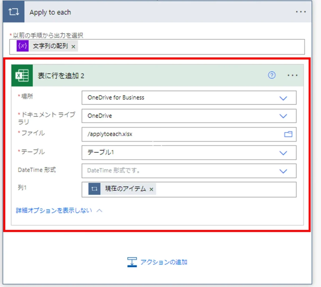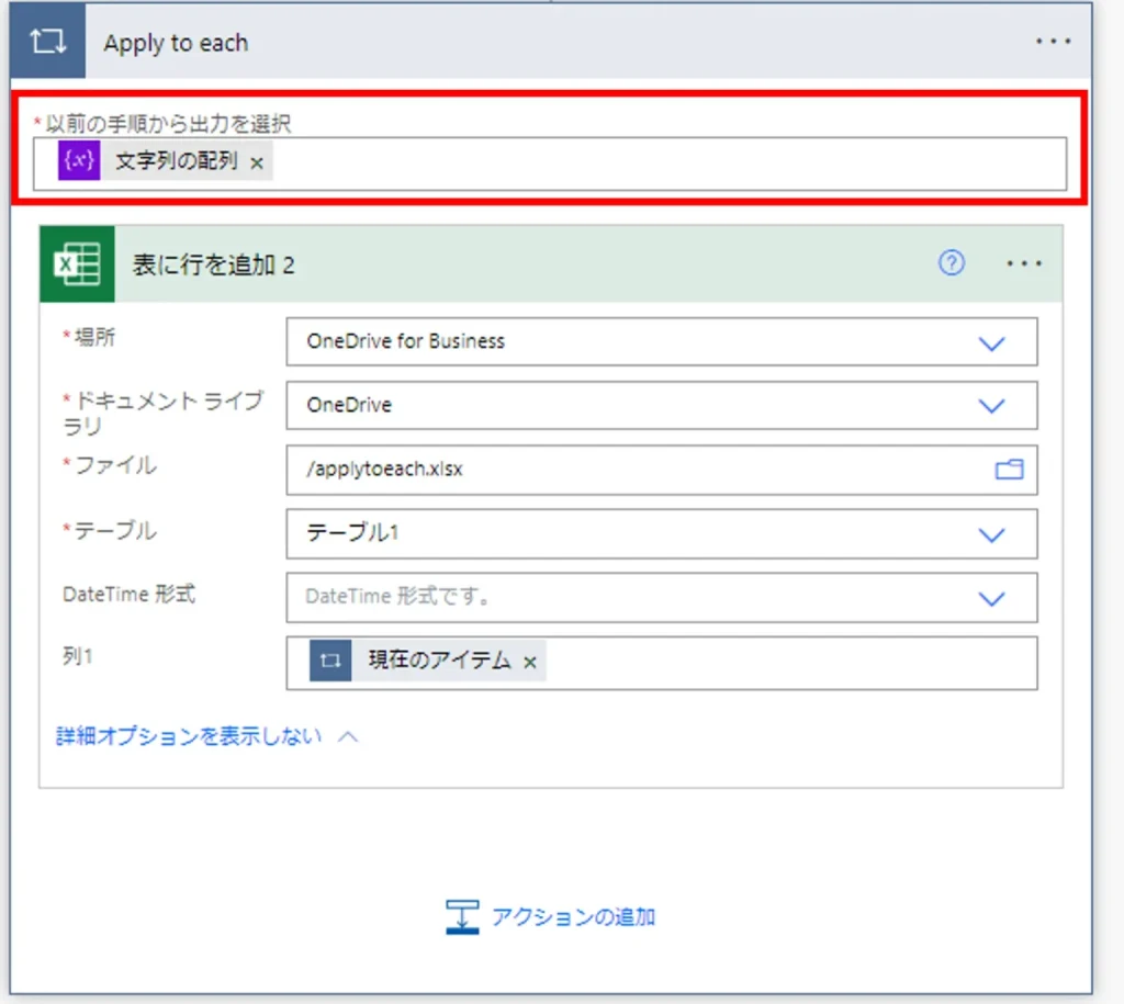 以下、複数の値が入った「文字列の配列」の値の数だけ、Excelへの行追加を繰り返すフローです。