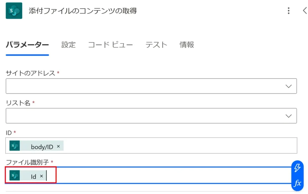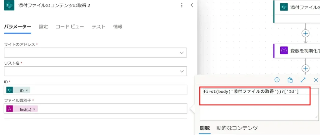 「添付ファイルのコンテンツの取得」アクションの「ファイル識別子」に、作成した式を入力します。