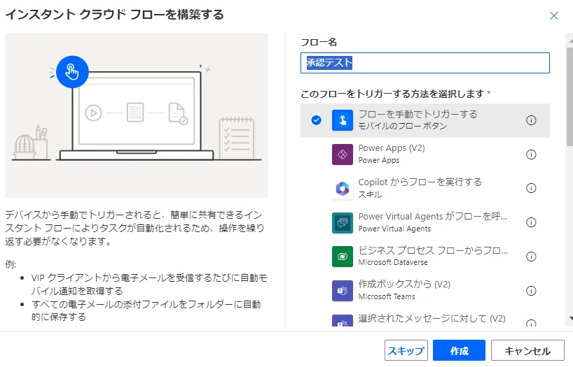 「インスタント クラウド フロー」を作成してください。