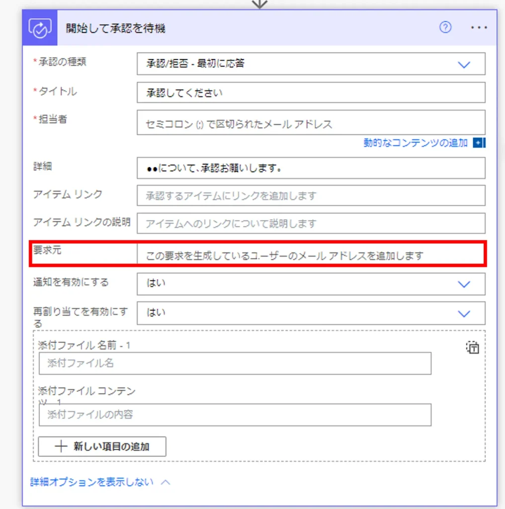 「開始して承認を待機」アクションの「要求元」と、同じように設定しましょう。