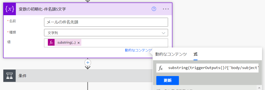 ポイントは、Value内に先ほどの「メールの件名先頭5文字を取得する計算式」を記載することです。